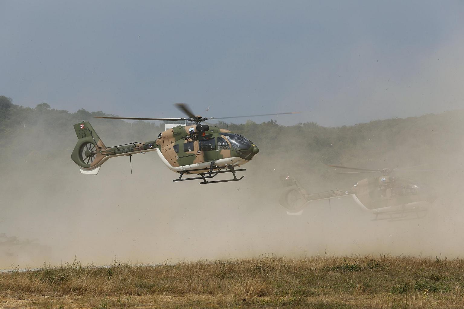 The Royal Thai Navy helicopter EC645 T2 participating in the amphibious assault joint military exercise component of Cobra Gold 2017 at a military base in Chonburi province, Thailand, on Feb 17, 2017.