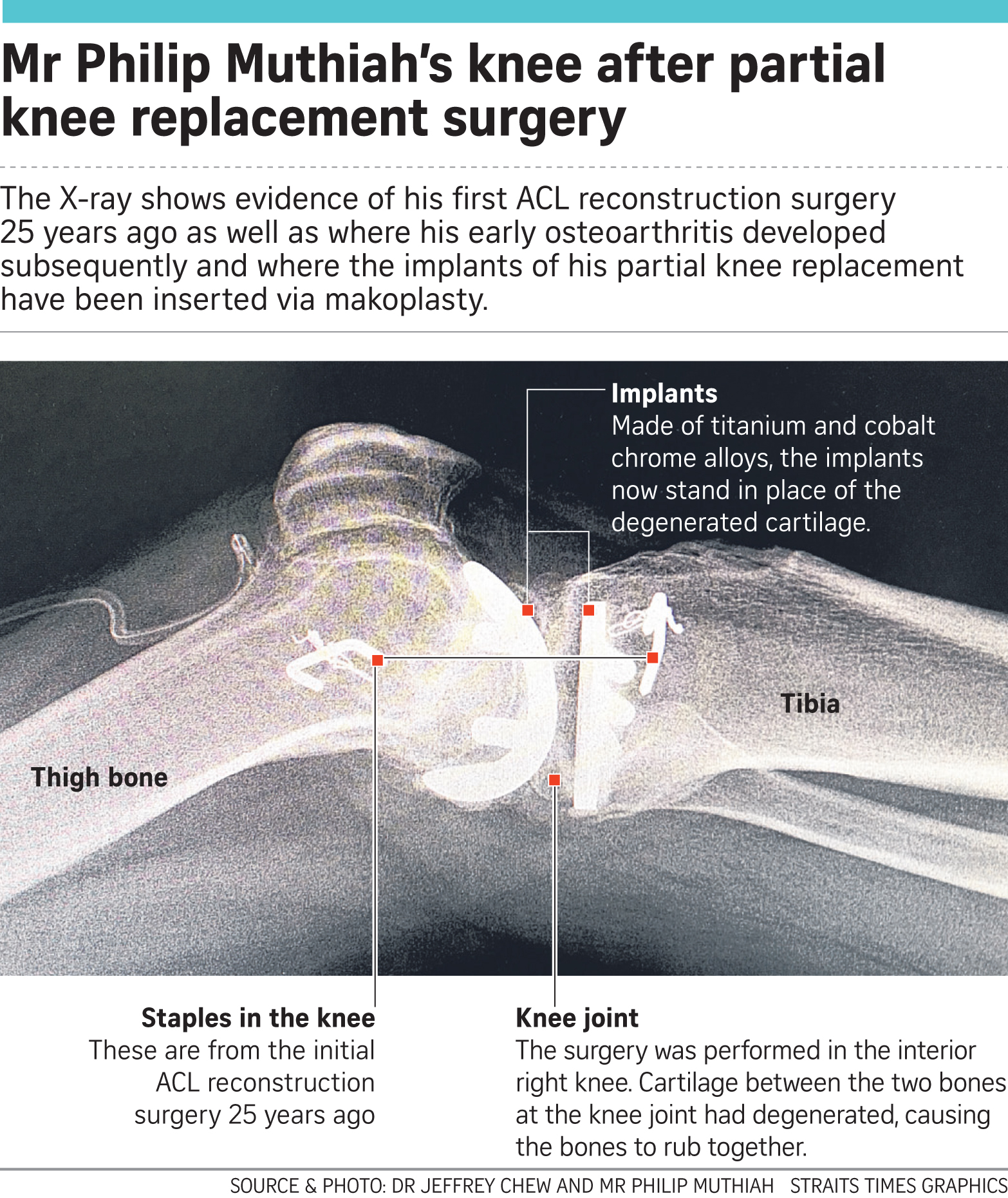 Mr Muthiah's osteoarthritis had progressed to the point where he needed surgery. As the arthritis was restricted to the inner compartment of his knee and his repaired ACL was in a stable condition, he was able to opt for partial knee replacement. He had it done in August.
