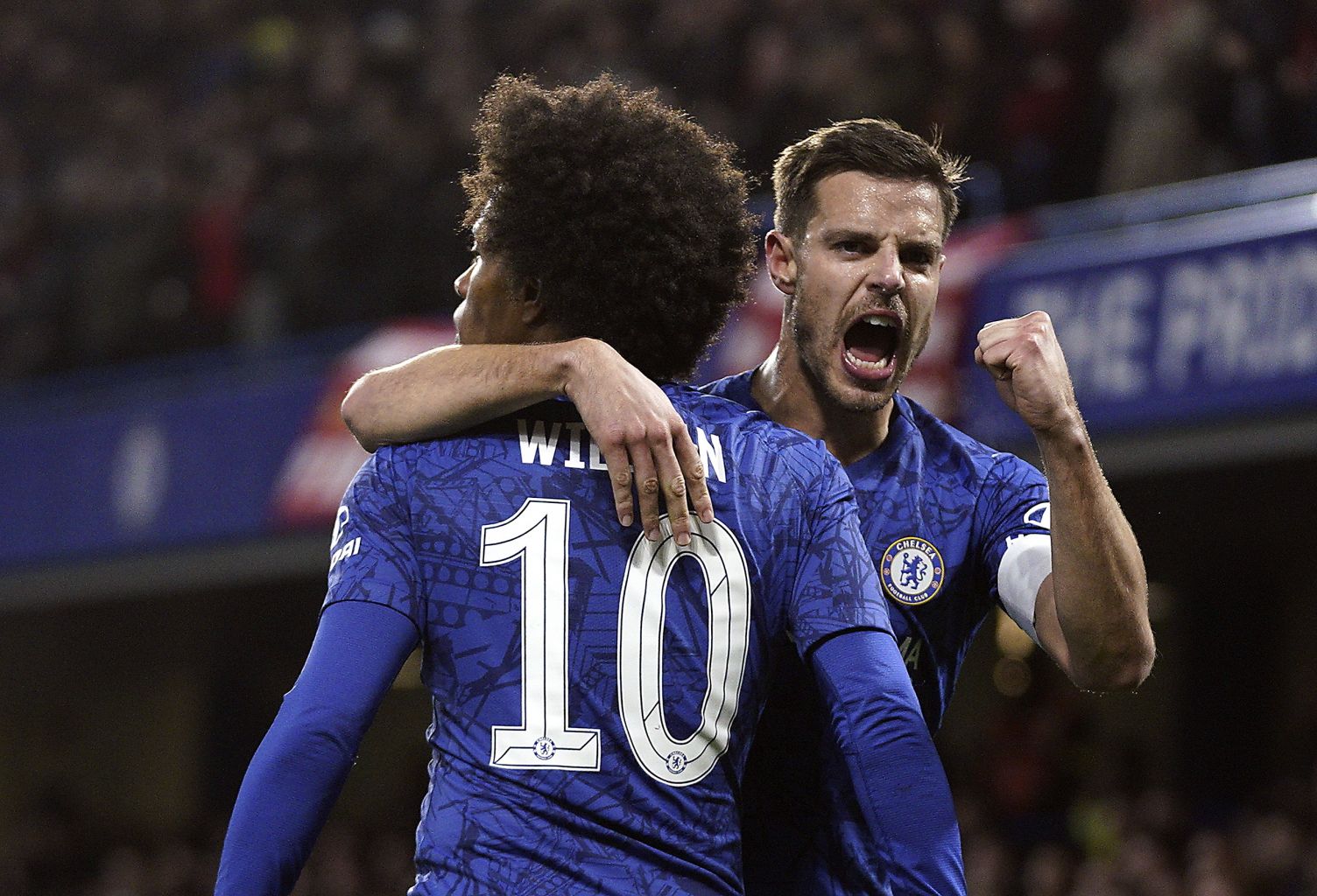 Chelsea's Willian Borges da Silva celebrates with Cesar Azpilicueta (right) after scoring the 1-0 lead.