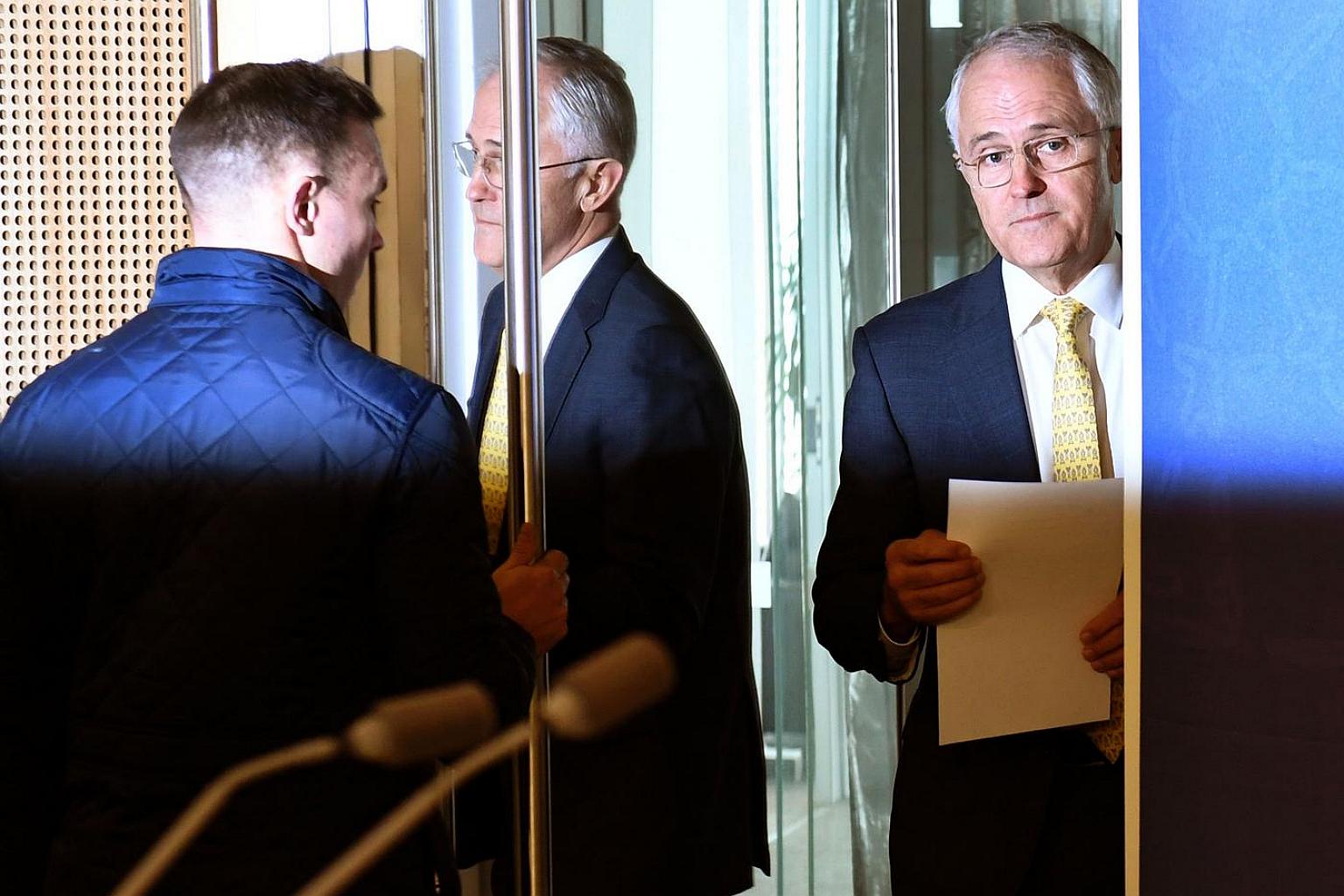 Australia's Prime Minister Malcolm Turnbull (right) arrives at a press conference in Sydney on July 3, 2016.