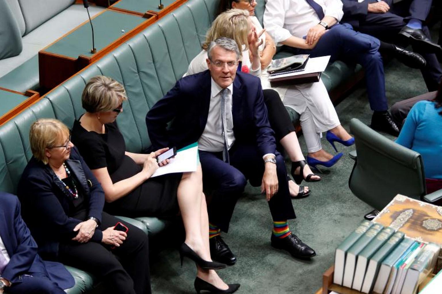 Australian Labour Party member, Shadow Attorney-General Mark Dreyfus (centre), wears rainbow socks in support of same-sex marriage at the House of Representatives in Canberra on Dec 7, 2017, ahead of the parliamentary vote on marriage equality.