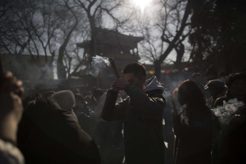 A man prays with incense sticks to celebrate the Lunar New Year, marking the Year of the Dog, at the Lama temple in Beijing on Feb 16, 2018.