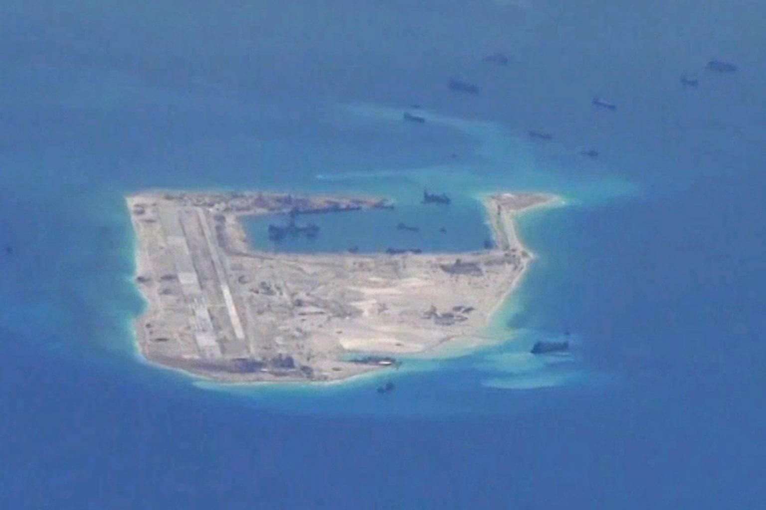 Chinese dredging vessels are purportedly seen in the waters around Fiery Cross Reef in the disputed Spratly Islands in the South China Sea in this still image from video taken by a P-8A Poseidon surveillance aircraft provided by the United States Navy on May 21, 2015.