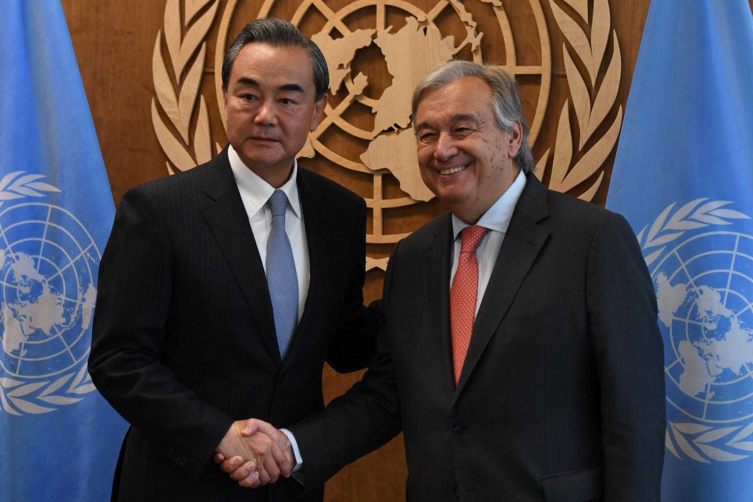 United Nations Secretary General Antonio Guterres (right) met with Mr Wang Yi, China's Minister for Foreign Affairs, on Sept 18, 2017, at the United Nations in New York.