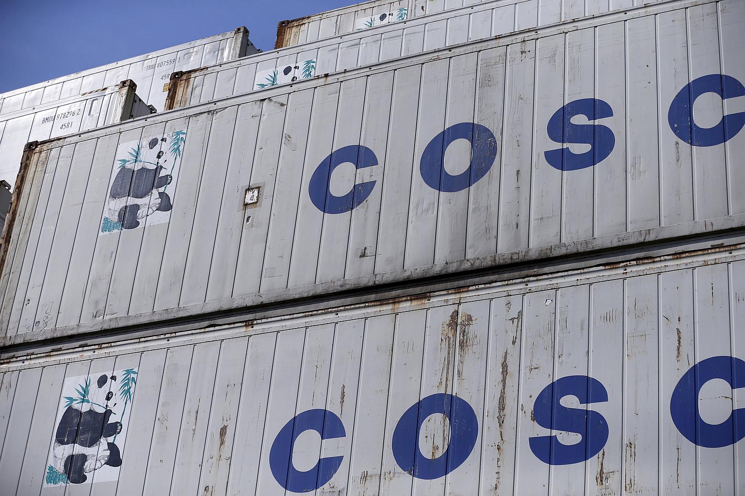 Containers from China Ocean Shipping Company (COSCO) pictured at a port in Shanghai, China, February 17.