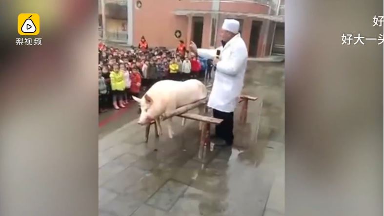 In footage posted on Pear Video, a China-based short video platform, a man in white robe was seen cutting open a pig which had been secured on a makeshift wooden rack, as children at the Fuwawa kindergarten tried to squeeze to the front to watch the butchering.