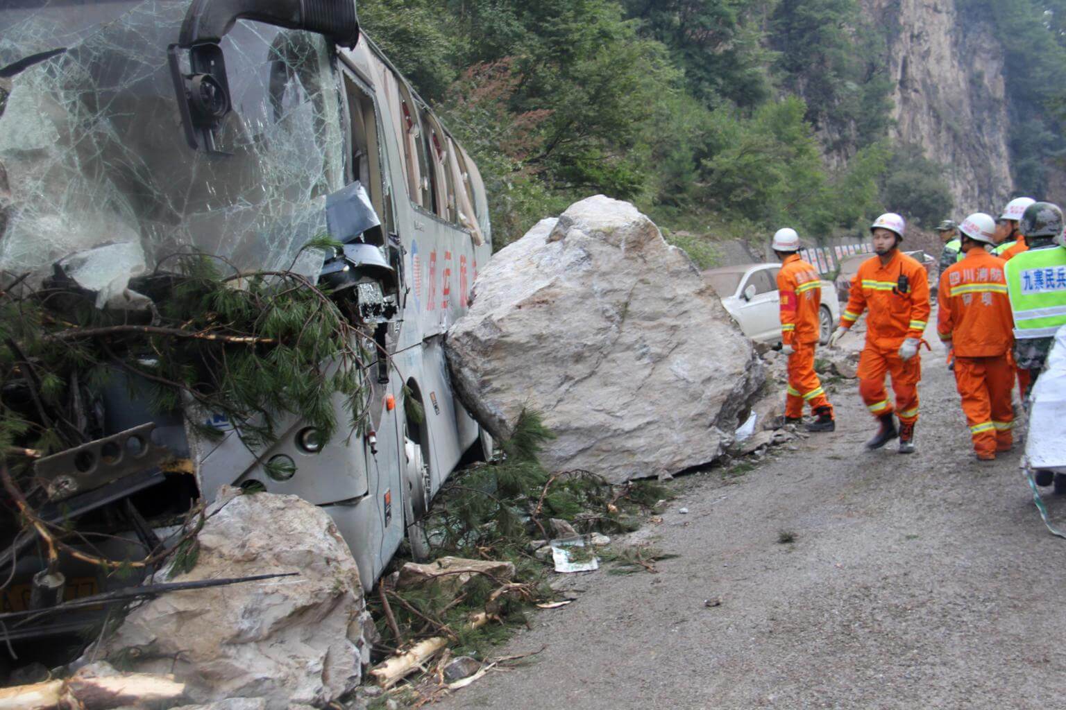 Chinese paramilitary police conducting rescue operations near a wrecked tour bus, in Jiuzhaigou in Sichuan province, on Aug 9, 2017.