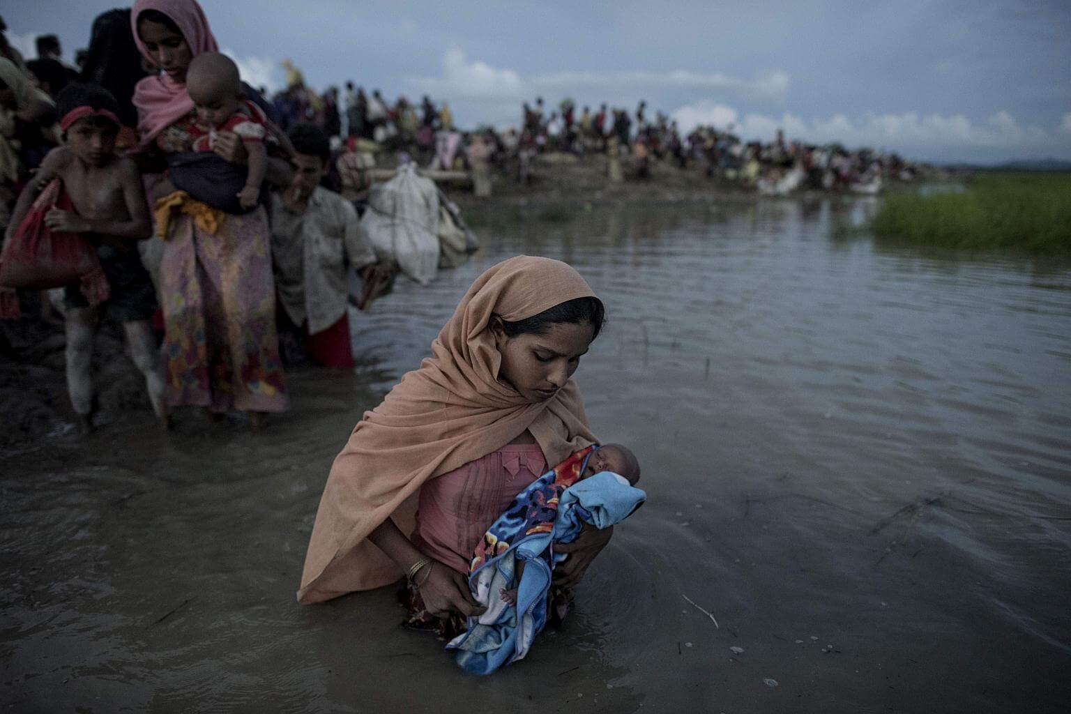 A file photo of a Rohingya refugee wading while holding a child after crossing the Naf river from Myanmar into Bangladesh in Whaikhyang.