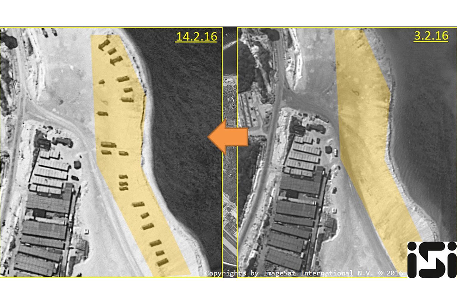 A satellite image of Woody Island on Feb 14, 2016 and Feb 3, 2016.