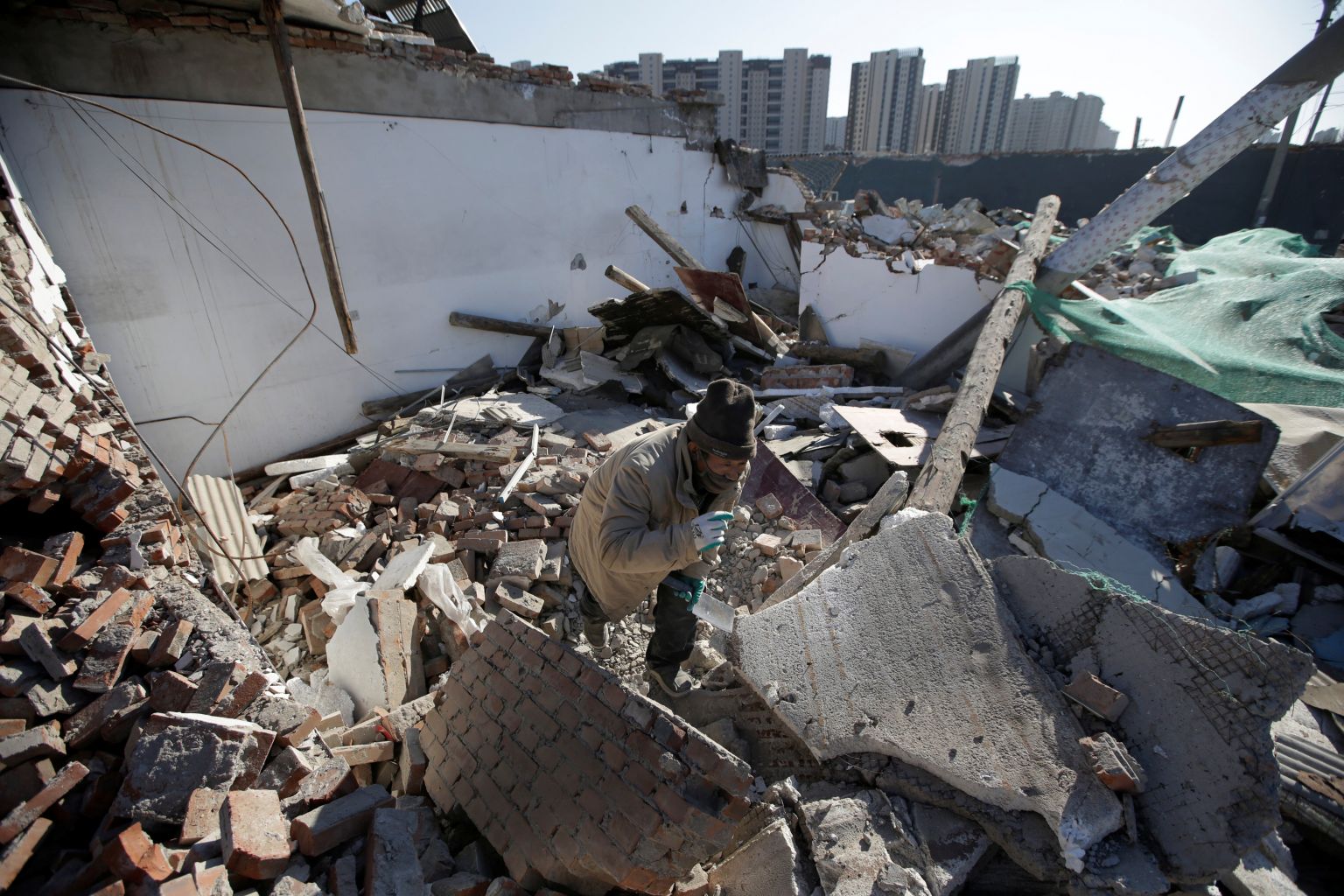 A migrant worker collects bricks from the debris of demolished low-cost dwellings at a village in the Tongzhou district of Beijing.