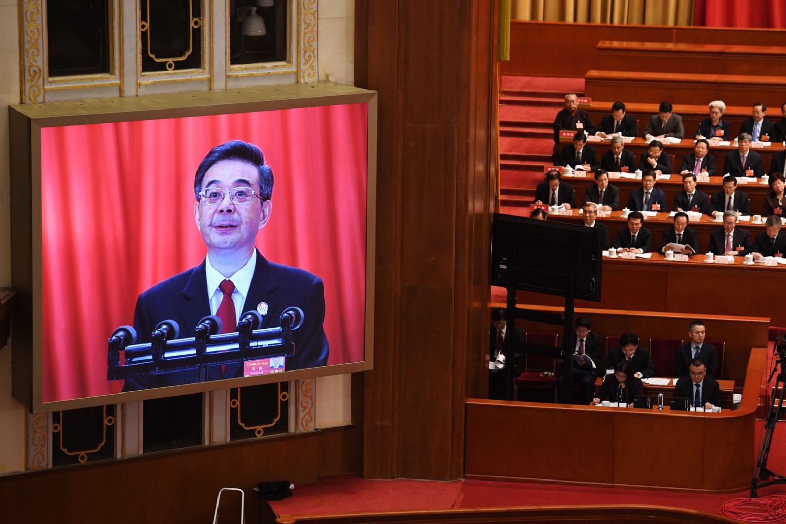 Mr Zhou Qiang, Chief Justice and head of the Supreme People's Court, being shown on screen as he reads the work report during the National People's Congress at the Great Hall of the People in Beijing on March 9, 2018.