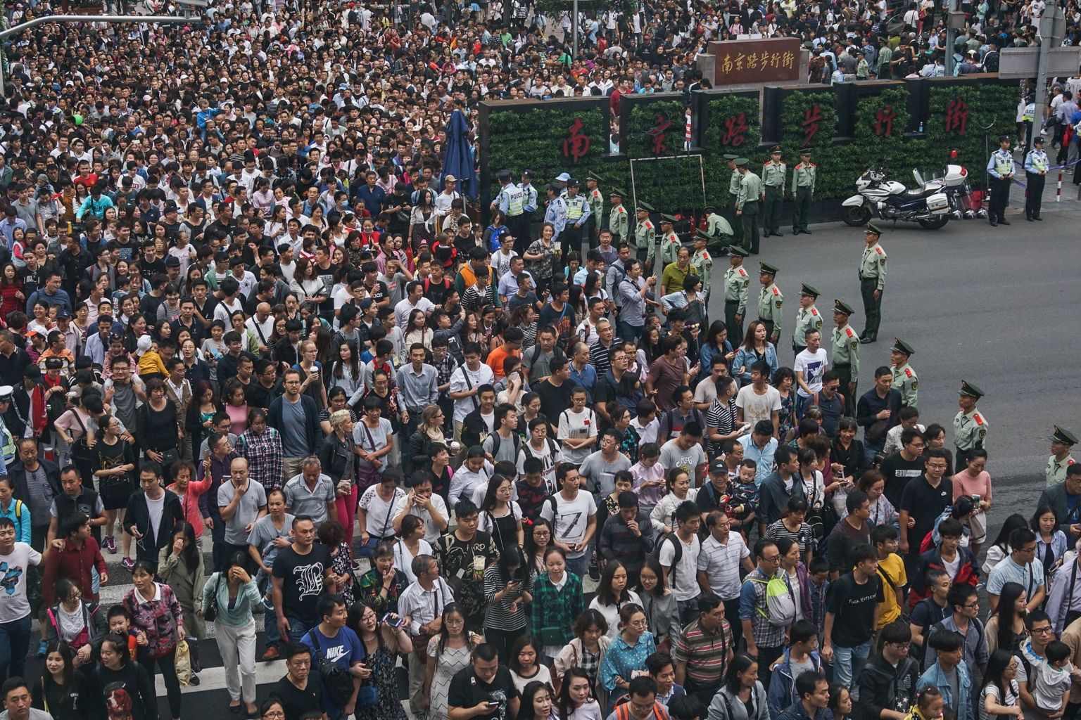 Chinese security personnel keep watch on pedestrian traffic during the week-long 'Golden Week' holidays at a zebra crossing in Shanghai, on Oct 3, 2017.