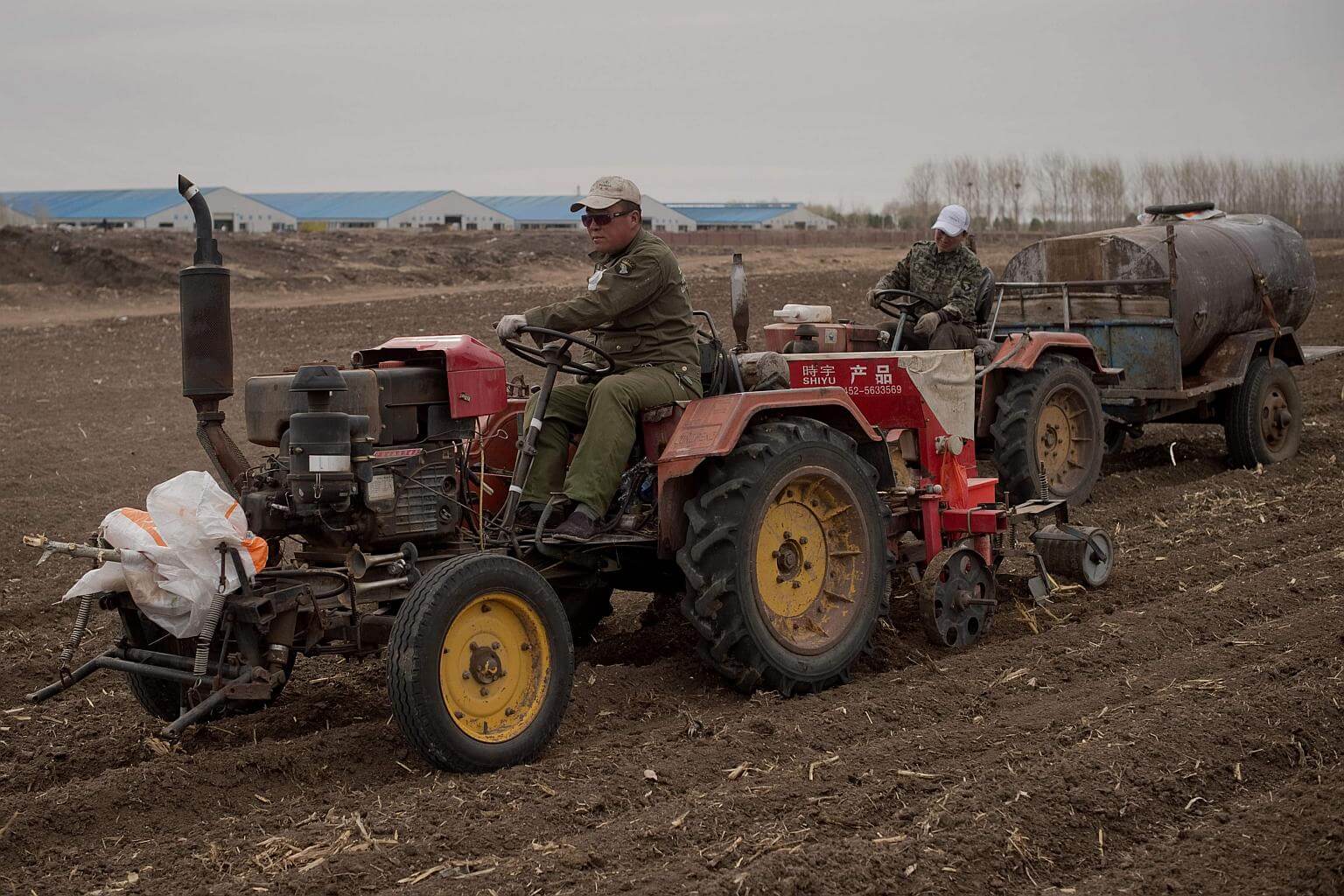 Farmers with tractors working in a corn field in front of a dairy farm (back) in Gannan county, Heilongjiang province, on May 3, 2016.