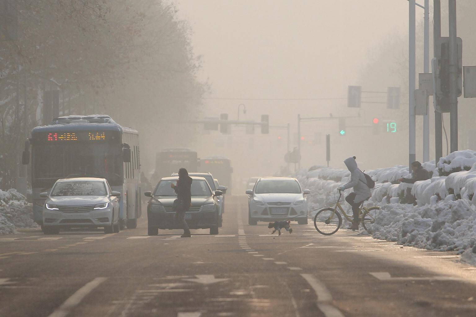 Pedestrians cross a road amidst smog on a polluted day in Nanjing, Jiangsu province, China, on Jan 30, 2018.