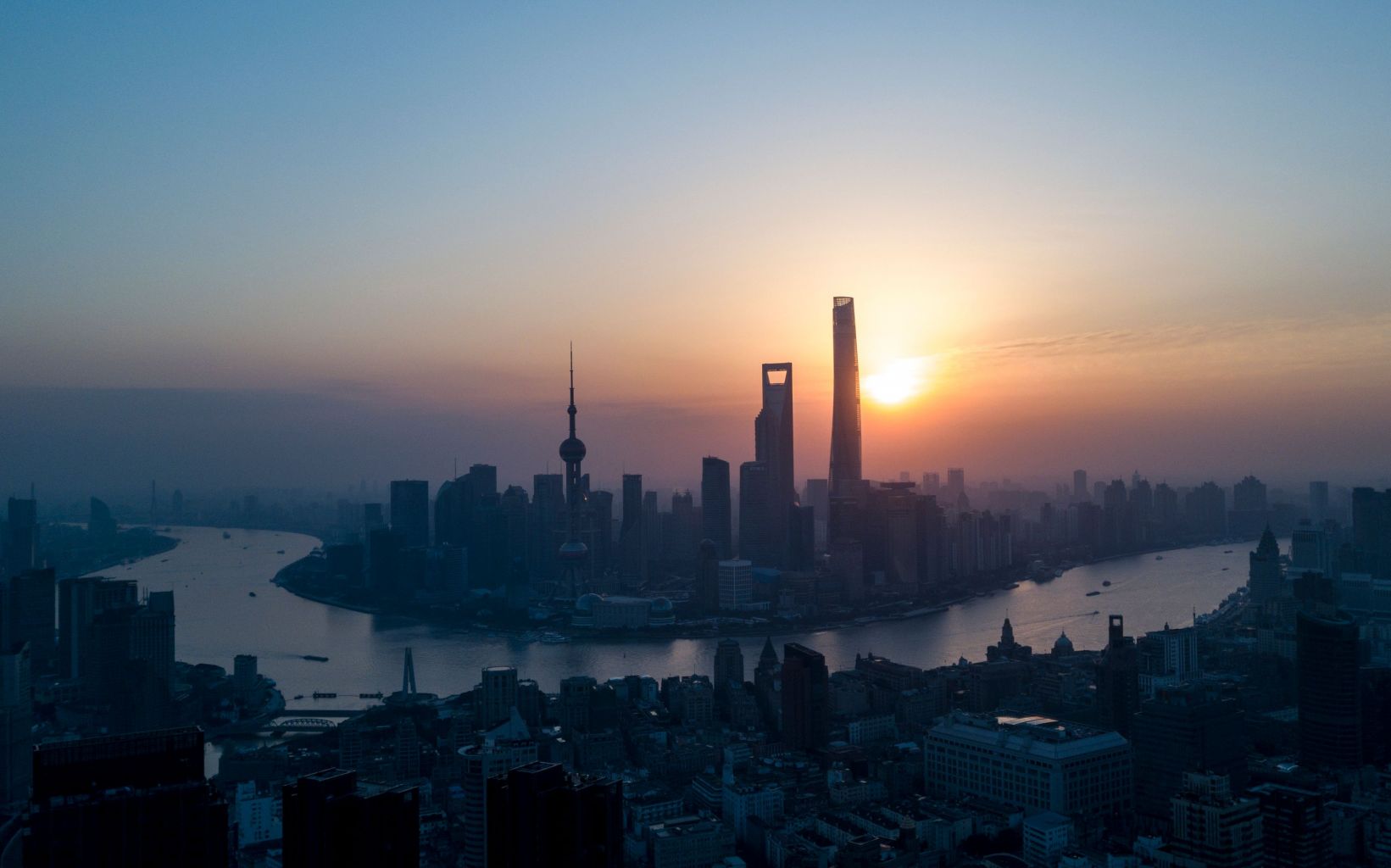 The sun rises over Shanghai's Lujiazui Financial District, along the Huangpu River, on Feb 4, 2018.