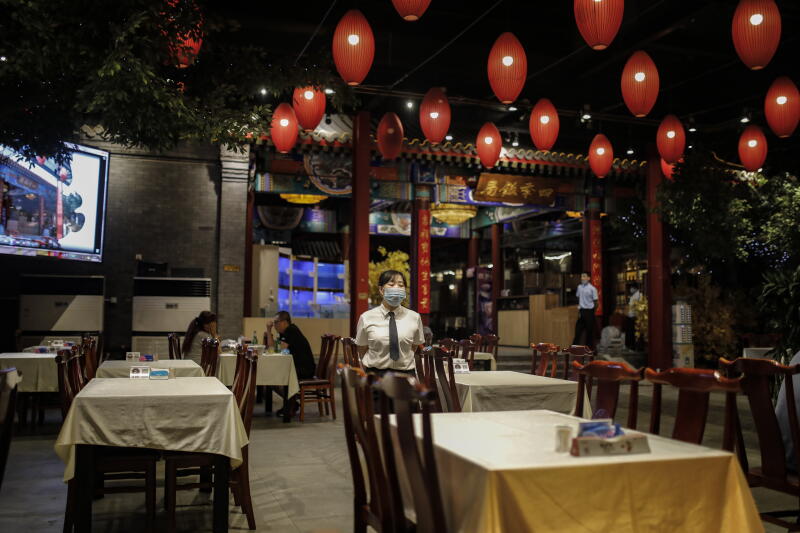 A waitress standing in a near-empty restaurant amid a wave of new Covid-19 cases in Beijing on June 20, 2020.
