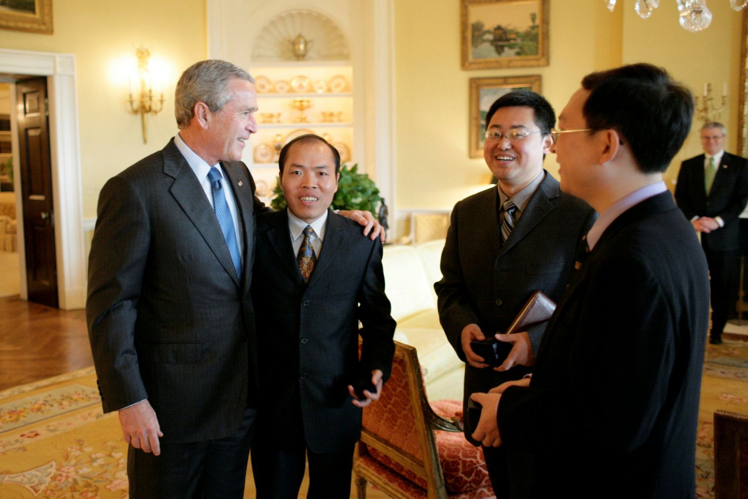 Chinese rights lawyer Li Baiguang (second from left) and other Chinese human rights activists meet then-US President George W. Bush at the White House May 11, 2006.