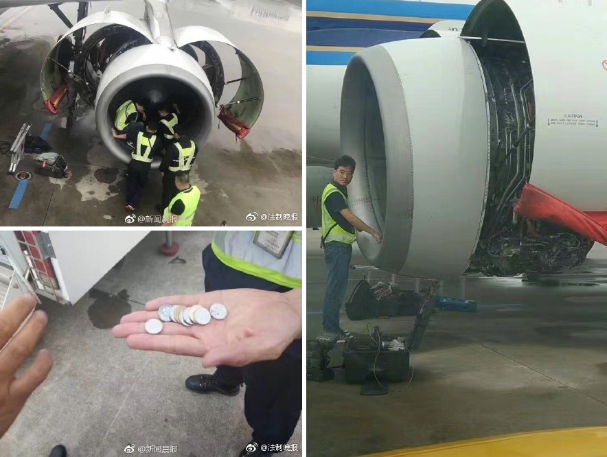 After maintenance crew inspected the aircraft, they found nine coins in one engine. The captain was quoted as saying that if the metal was sucked up by the engine, it could have caused a catastrophic failure.
