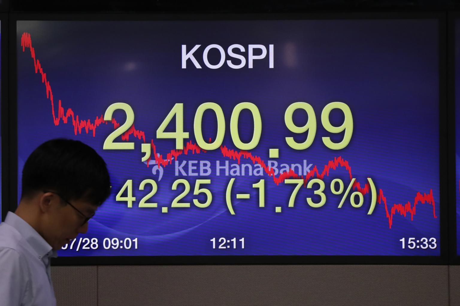 In South Korea, the Kospi index fell as much as 1 per cent. The won declined as much as 0.8 per cent, falling to a three-week low, while the cost of insuring five-year South Korean sovereign bonds from nonpayment climbed and the Kospi 200 volatility index jumped 30 per cent.
