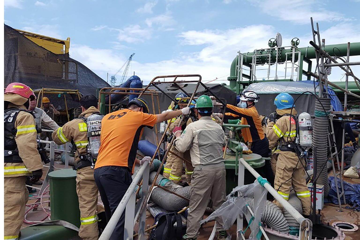 Rescue members search for victims after an explosion at an STX Offshore and Shipbuilding plant in the south-eastern city of Changwon, on Aug 20, 2017.