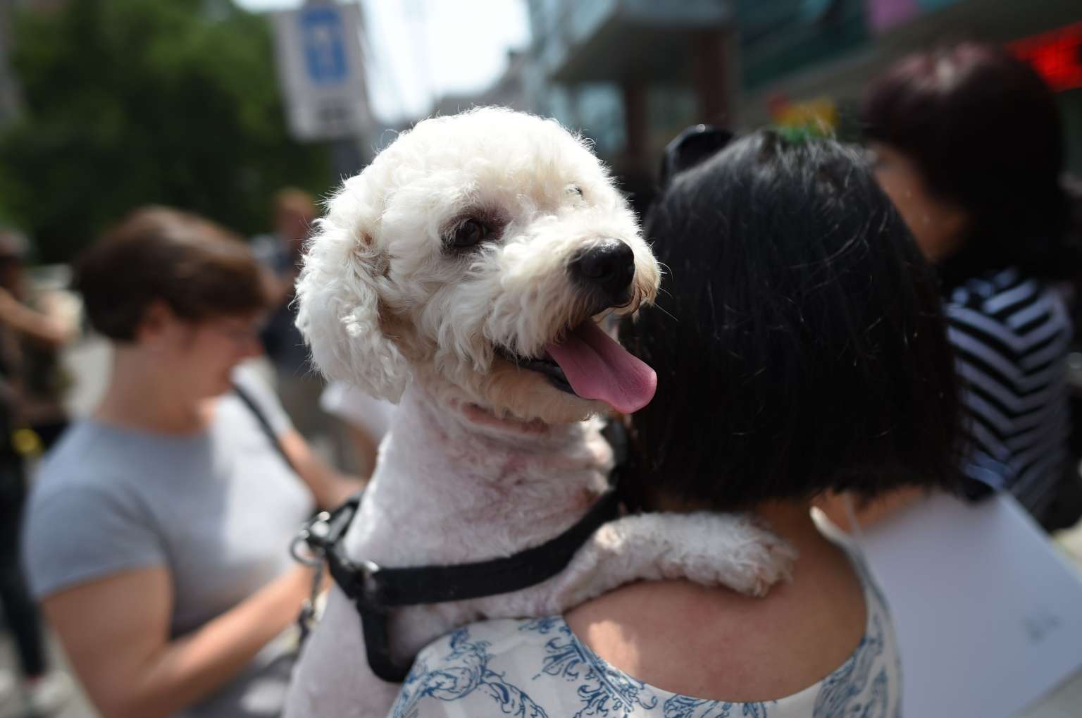 An animal activist carries her dog outside the Yulin government office in Beijing on June 10, 2016.