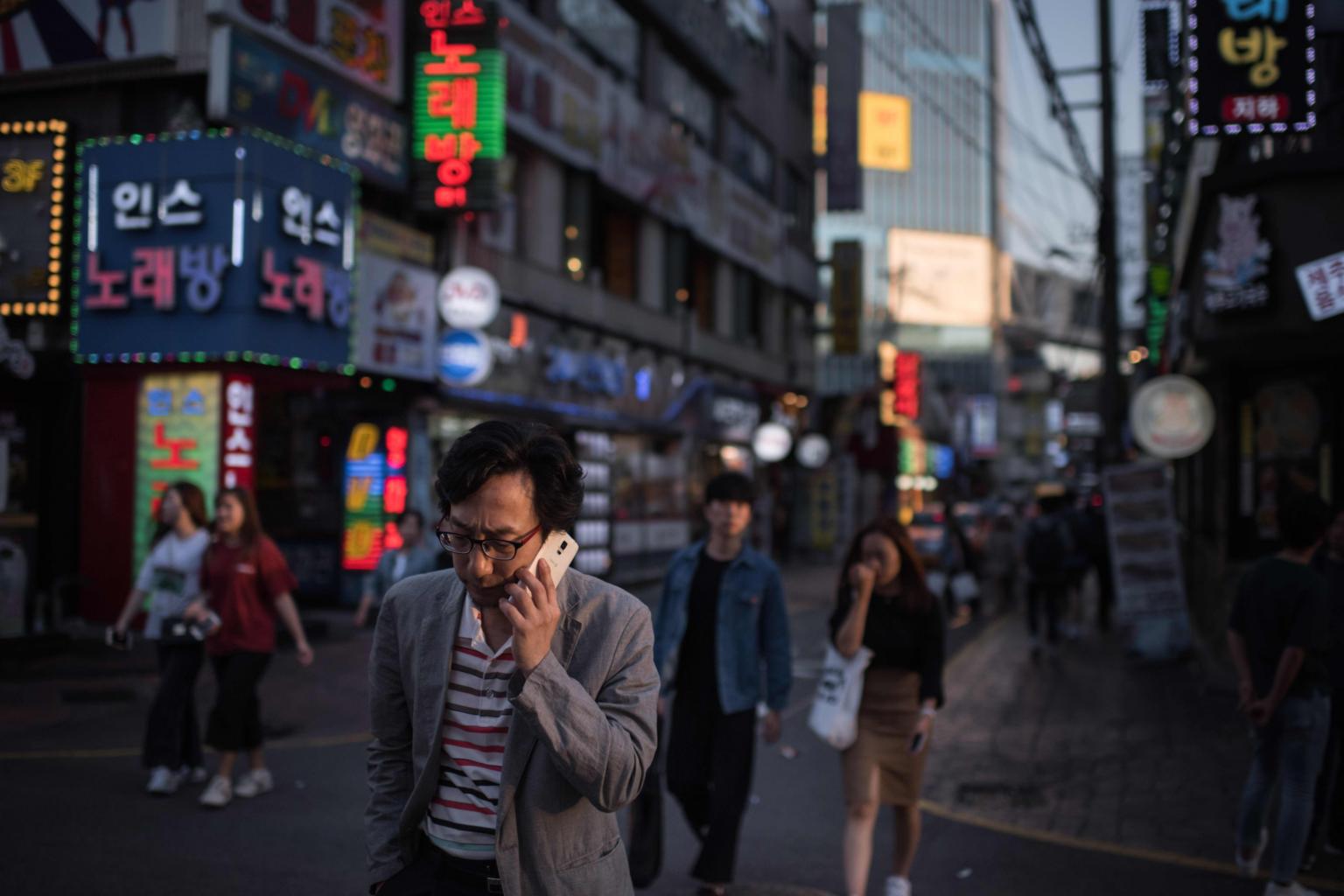 A man holds a mobile phone as he walks along a street in the Sinchon area of Seoul on Sept 13, 2017.