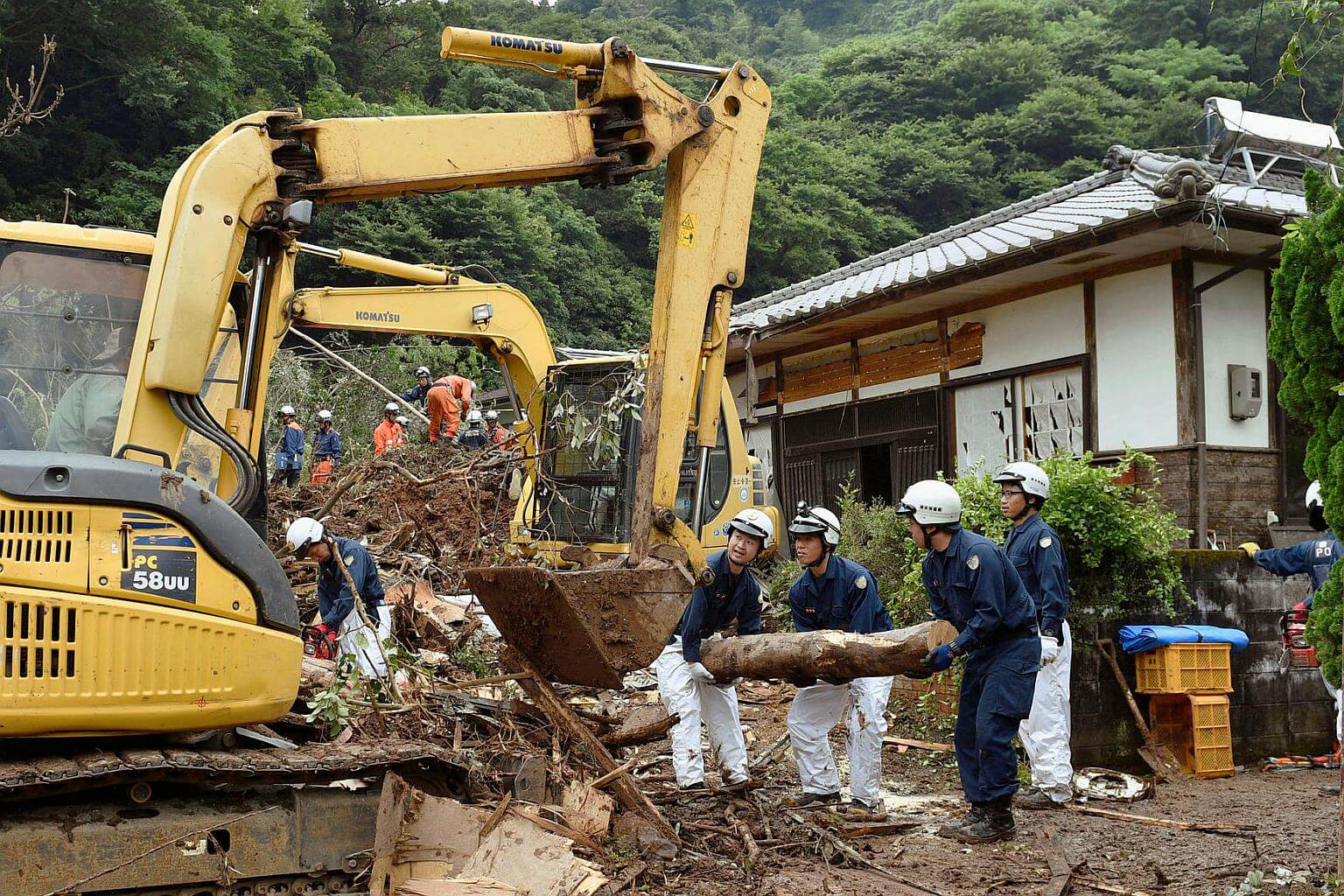 Rescue team members conduct search and rescue operations at a landslide site caused by heavy rain in Uto, Kumamoto prefecture, Japan on 21 June.