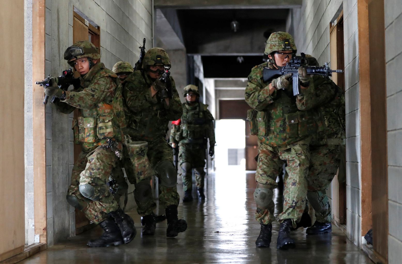 Japan Ground Self-Defence Force members taking part in an urban warfare drill during a joint military exercise with the US Army.