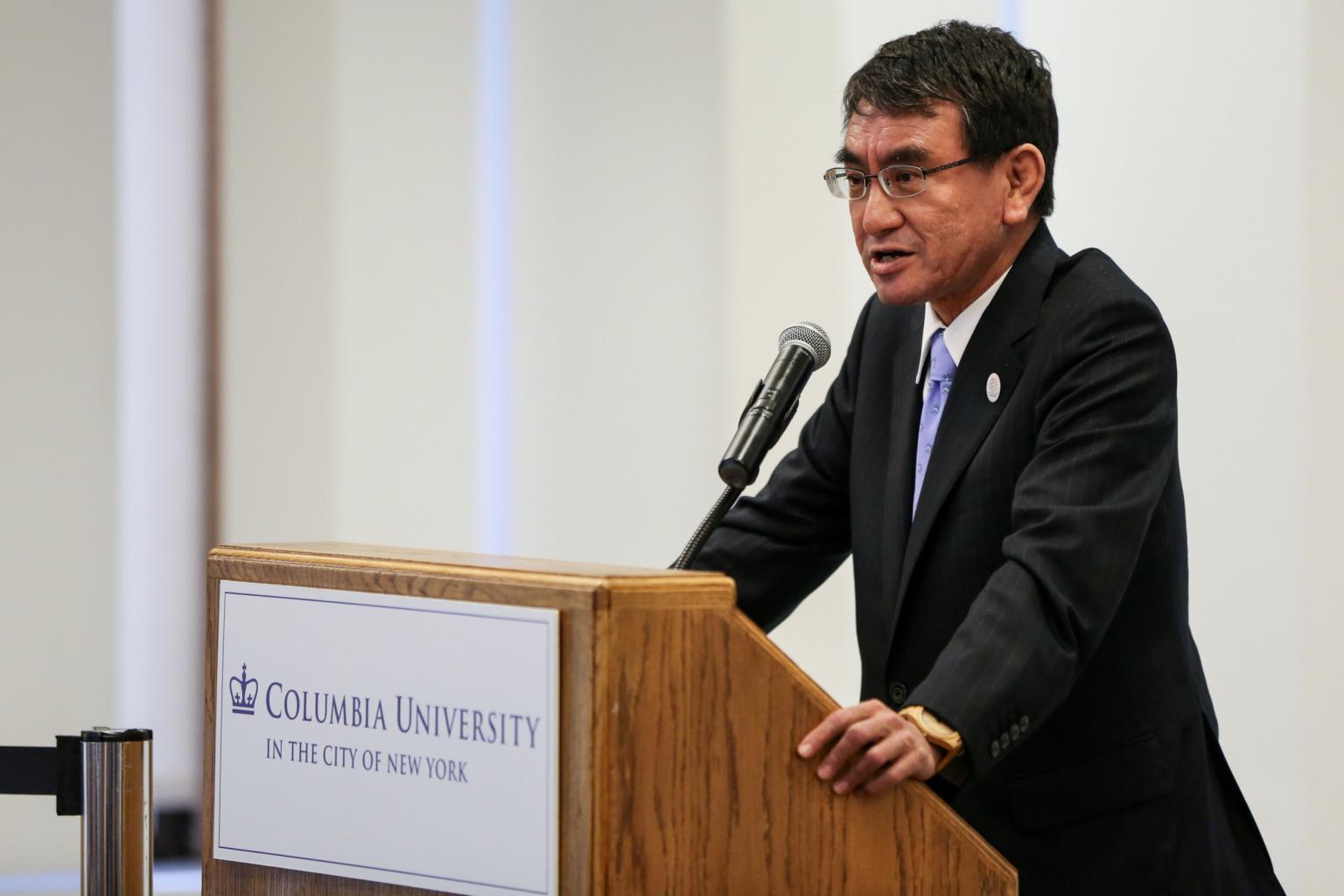 Japan’s Foreign Minister Taro Kono gives a speech at Columbia University in Manhattan, New York.