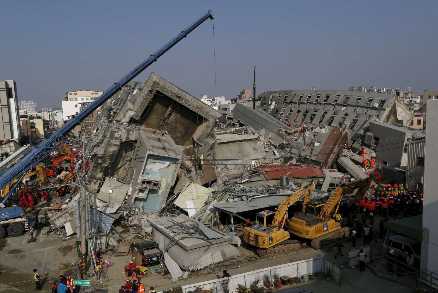 Rescue personnel work at the site where a 17-storey apartment building collapsed, after an earthquake in Tainan, southern Taiwan on Feb 7, 2016.