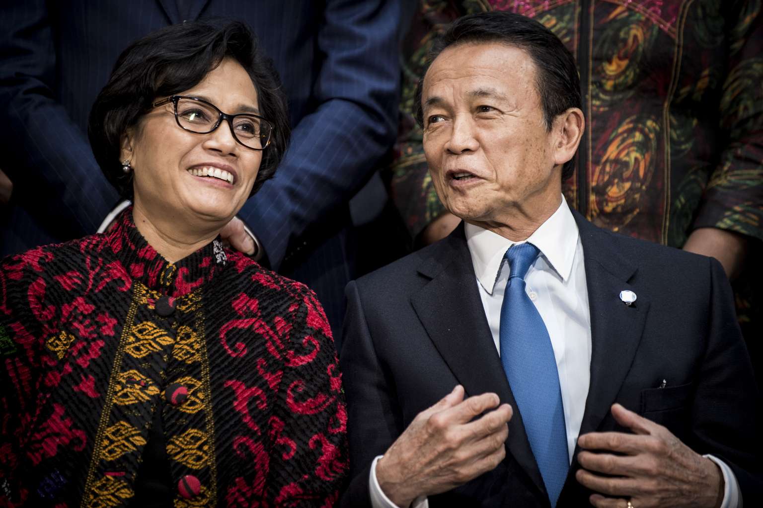 Taro Aso (right) and Indonesian finance minister Sri Mulyani Indrawati speak before a group photograph at the spring meetings of the MF and World Bank in Washington on April 22, 2017.