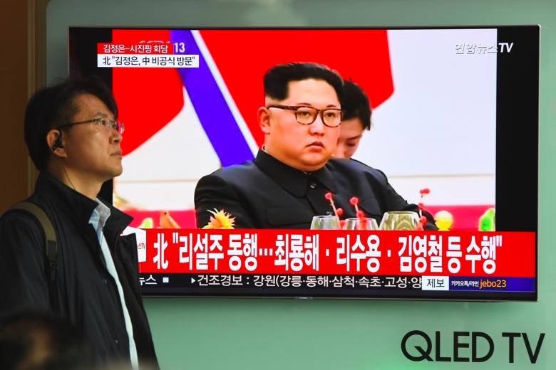 A man walks past a television screen showing a news report about a visit to China by North Korean leader Kim Jong Un, at a railway station in Seoul on March 28, 2018.