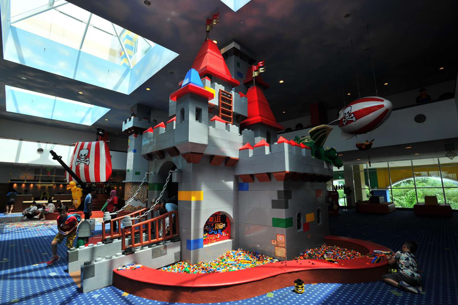 Children playing at the Lego-inspired knight's castle in the hotel lobby of Legoland Malaysia Resort.