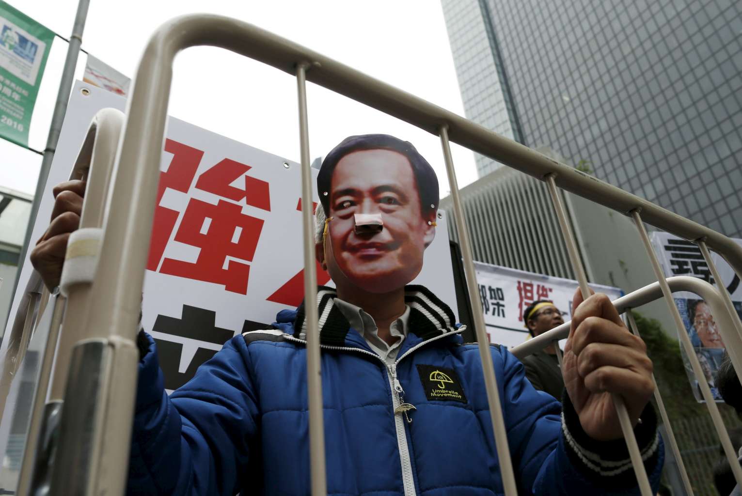 A demonstrator wears a mask depicting Causeway Bay Books shareholder Lee Bo during a protest over the disappearances, in Hong Kong, China, on Jan 10, 2016.