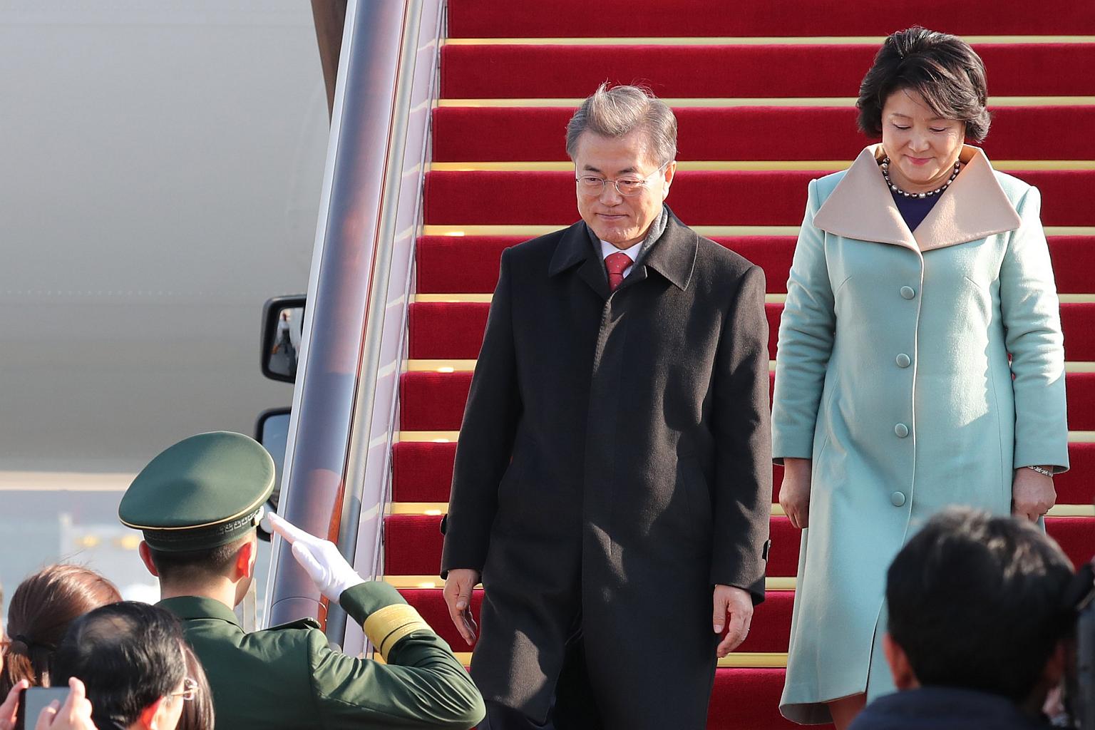 South Korean President Moon Jae In and his wife Kim Jung Sook arriving in Beijing for the start of their state visit, on Dec 13, 2017.