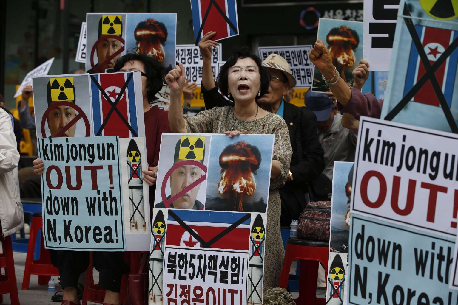 South Korean activists shout slogans as they hold up banners during a rally held to protest against North Korea's fifth Nuclear test on Sept 10, 2016.