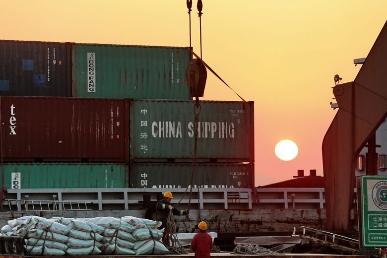 Workers loading ships at a port in Nantong, China, on March 9, 2018.