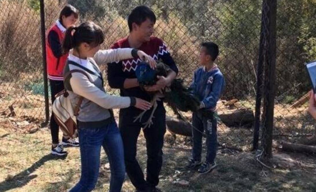 Visitors at Yunnan Wild Animal Park holding a peacock as they pose for photos.