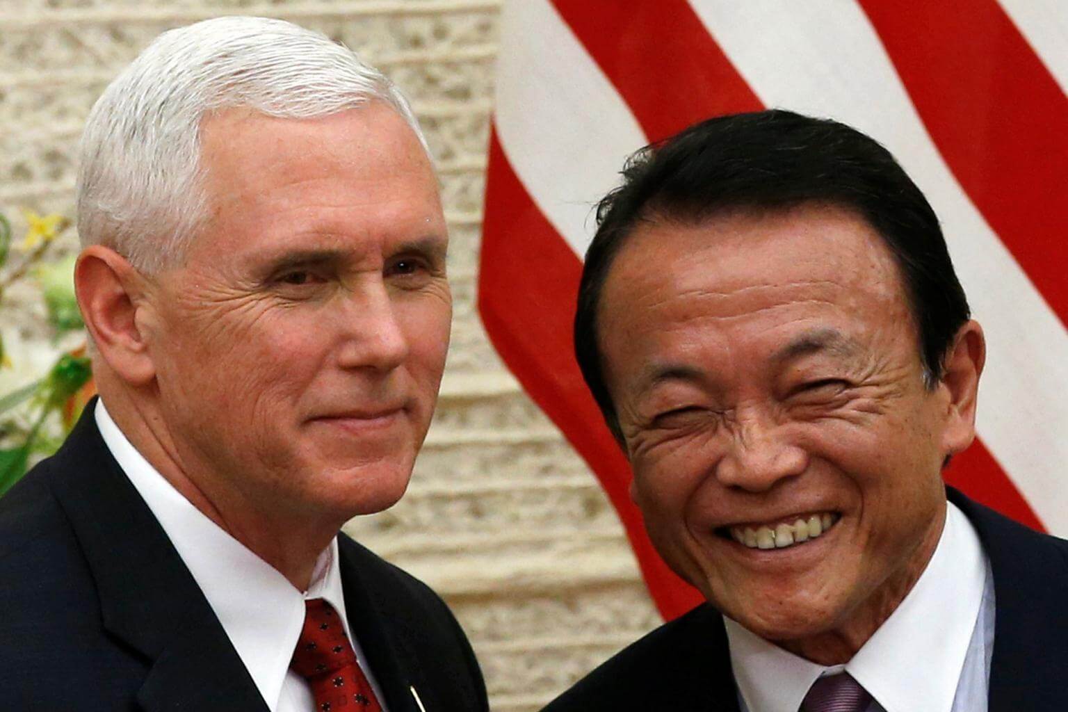 US Vice President Mike Pence and Japan's Deputy Prime Minister Taro Aso attending a joint news conference after their talks in Tokyo on April 18, 2017.