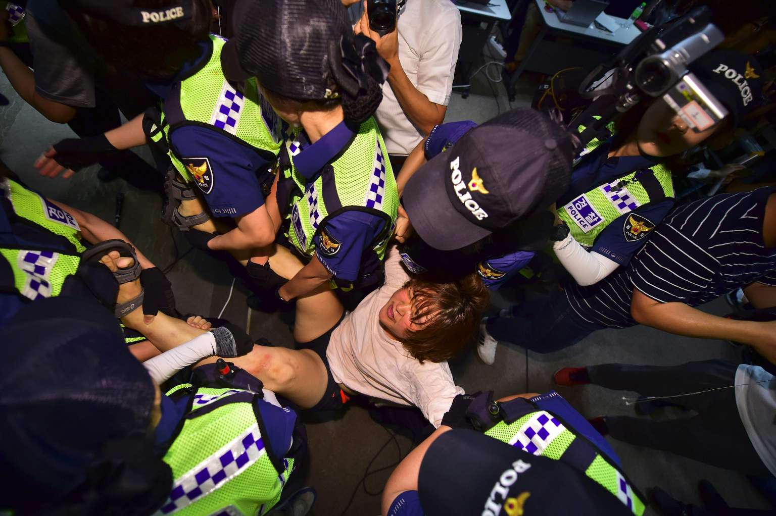 Police take away a South Korean protester occupying the venue as the protesters denounce a deal between Seoul and Tokyo on resolving a long-running row over "comfort women".