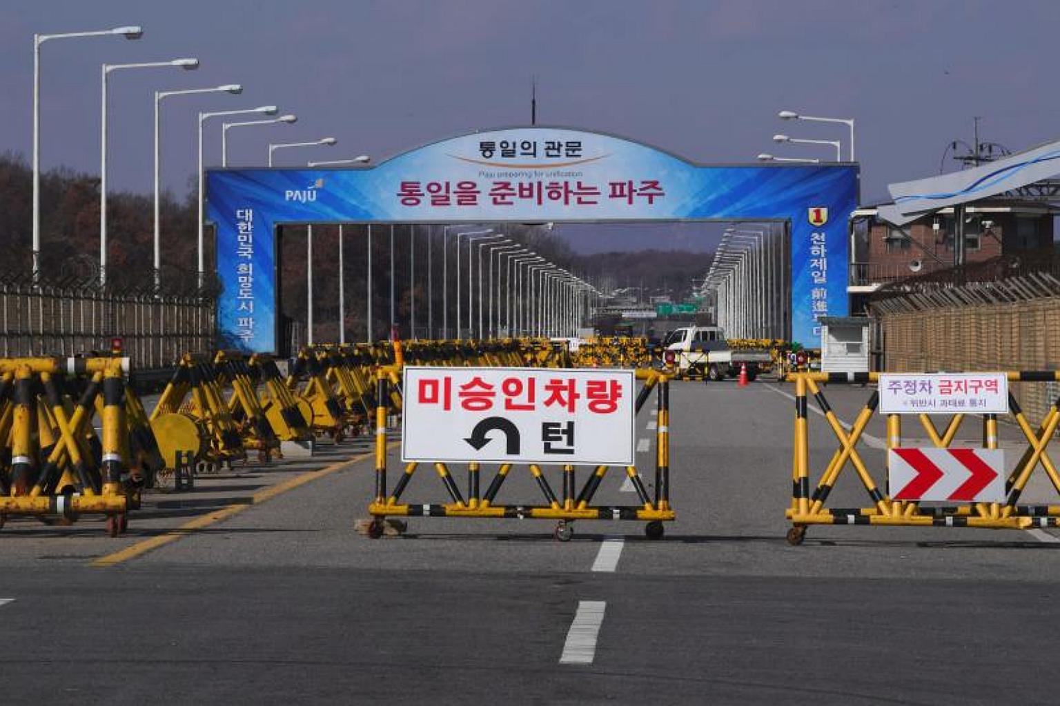 A barricade is seen on the road leading to the truce village of Panmunjom, in South Korea on Nov 14, 2017.