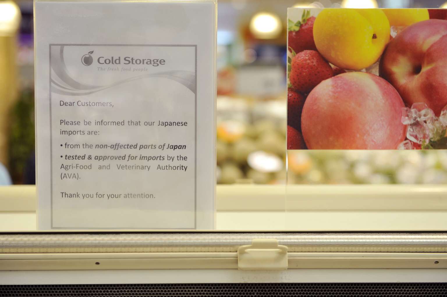Signs at Cold Storage supermarket in 2011 clarifying that food imports are from safe regions in Japan, and are tested by the Agri-Food and Veterinary Authority of Singapore.