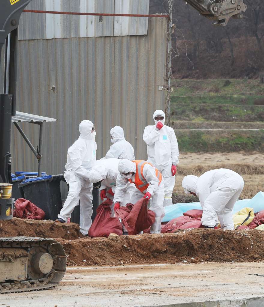 Local sanitation officials culling chickens at a farm in Hwaseong, south of Seoul, South Korea, on Nov 30, 2016.