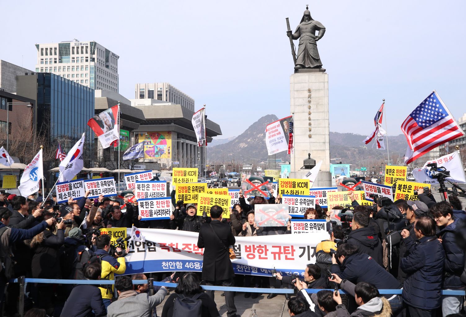 Protesters, including the families of the crewmen killed in the 2010 sinking of the Cheonan warship, stage a rally in Seoul to oppose the planned visit to South Korea by a vice-chairman of the Central Committee of the North's ruling Workers' Party, on Feb 24, 2018.