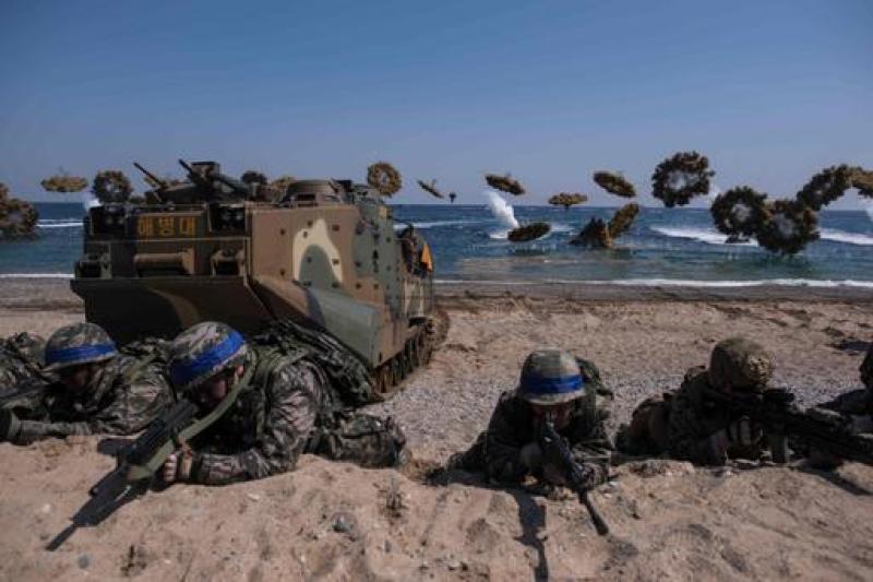 South Korean and US soldiers at an annual joint military landing exercise in Pohang on South Korea's southeast coast, on March 12, 2016.
