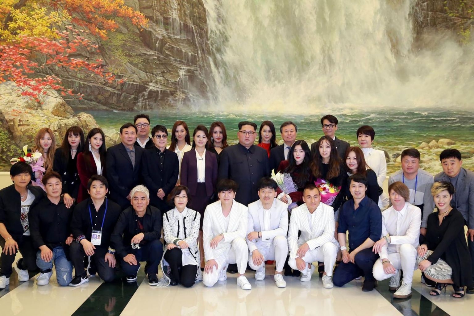 North Korean leader Kim Jong Un (back row, centre) and his wife Ri Sol Ju (back row, sixth from left) posing with South Korea's Culture, Sports and Tourism Minister Do Jong Hwan (back row, eighth from right) and South Korean musicians after a concert at the East Pyongyang Grand Theatre.