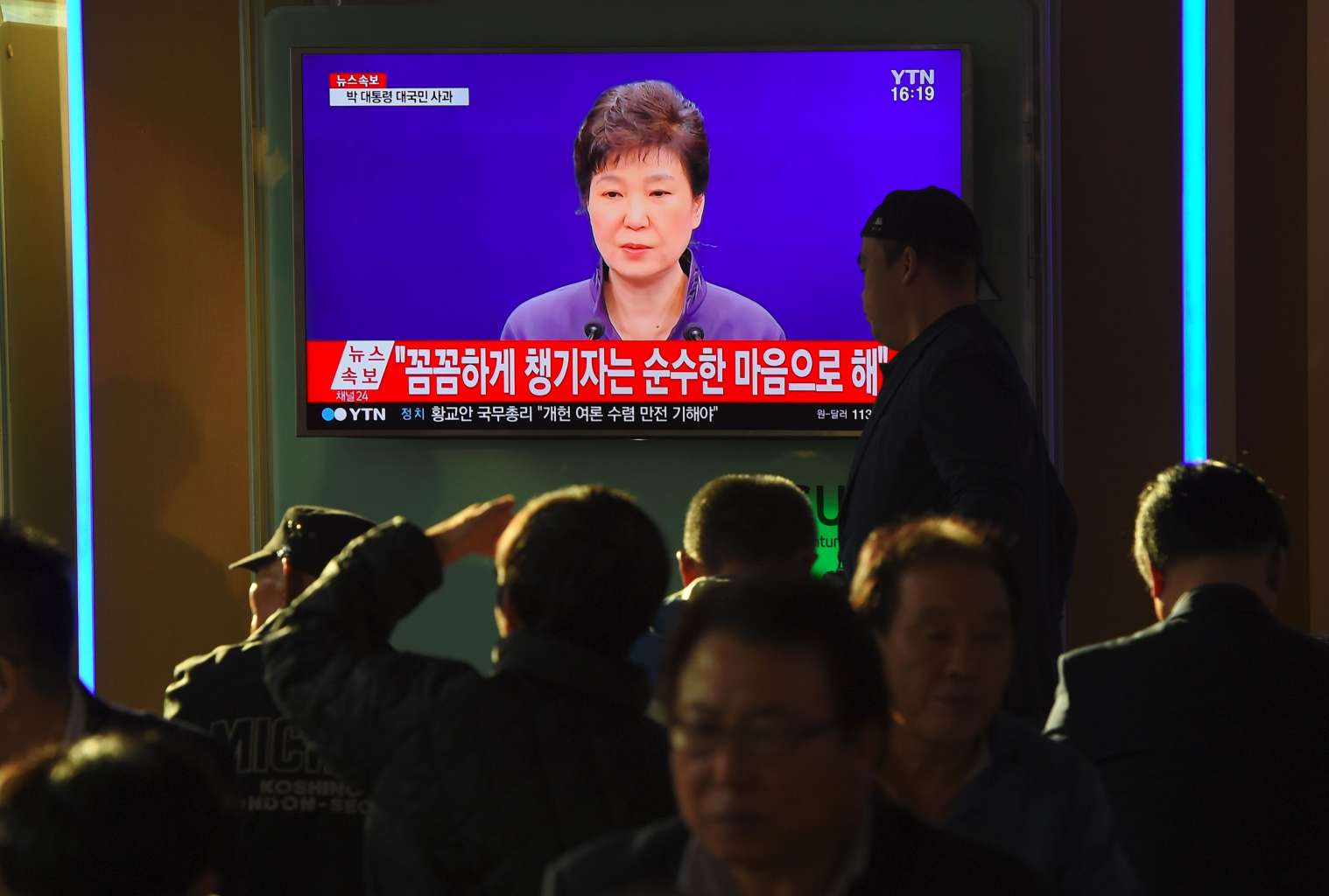 People at a railway station in Seoul watch a television news report showing South Korean President Park Geun Hye making a public apology on Oct 25, 2016.