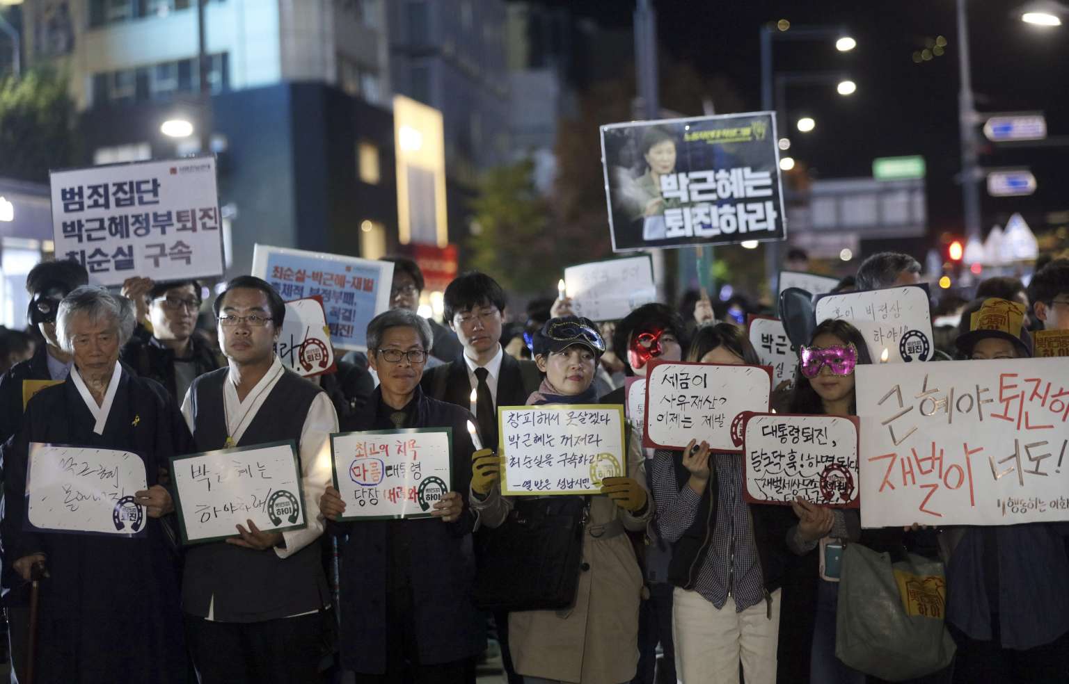 South Korea citizens and members of civic groups holding placards during a protest, demanding President Park Geun Hye to step down, in downtown Seoul on Oct 27, 2016.