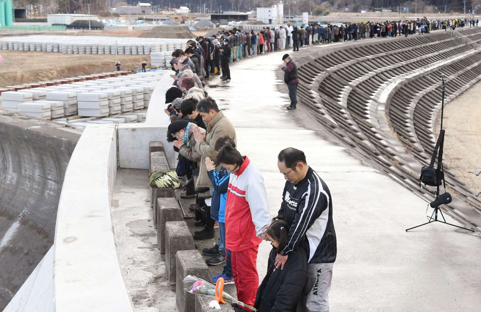 People observe a moment of silence atop a seawall at Taro district in Miyako, Iwate prefecture, Japan on March 11, 2017, to mark the the six-year anniversary of the magnitude 9.0 earthquake and tsunami disaster that struck Japan in 2011.