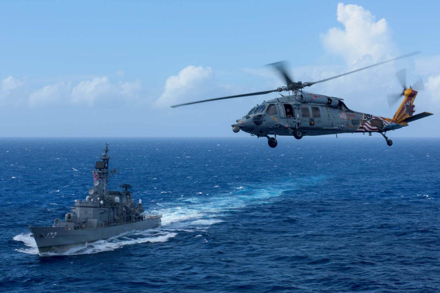 A US MH-60S Sea Hawk flies by Japan's Maritime Self-Defense Force ship JS Shimakaze above waters around Okinawa on Oct 9, 2017. Some 62 per cent of Japanese are worried over concerns about US President Donald Trump's global leadership.